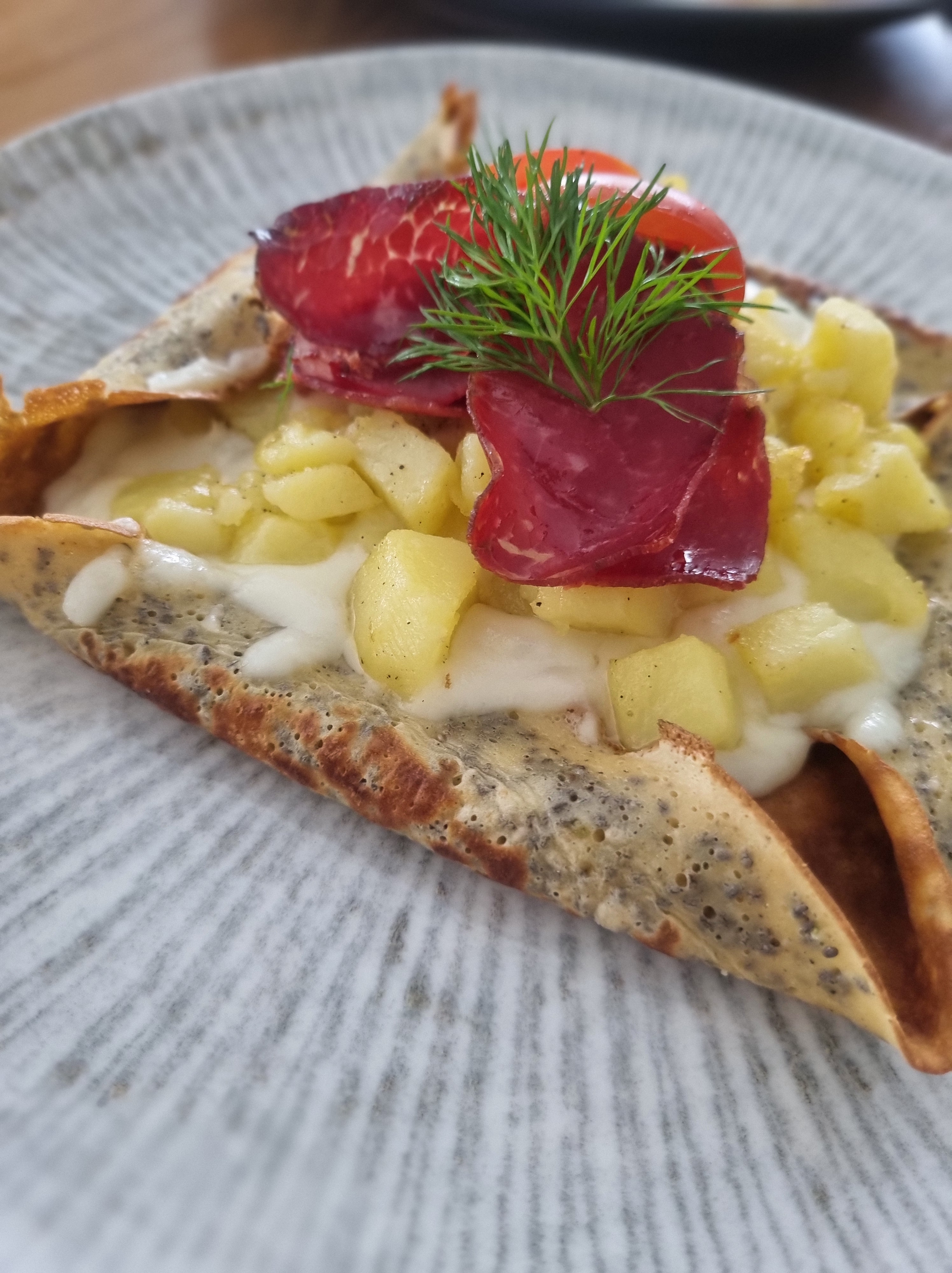 - Üzerini pastırma, cherry domates ve dereotu ile süsleyerek servis ediyoruz.