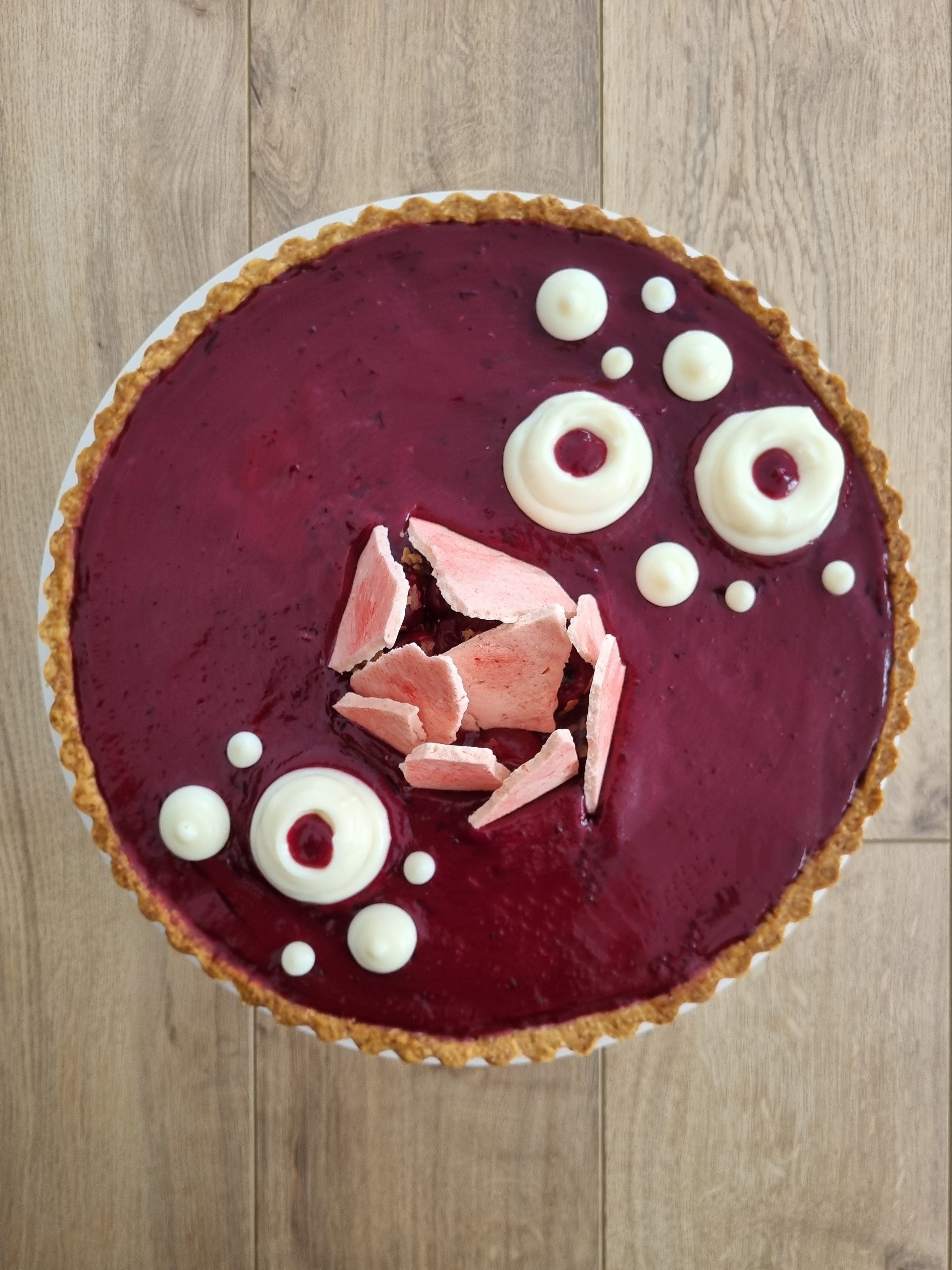 - Bütün malzemelerimiz hazır olduğunda; öncelikle tart kalıbının içine ilk olarak beyaz çikolatalı kremamızı koyuyor ve spatula yardımıyla yüzeyini düzeltiyoruz. Ardından ise ince bir katman halinde berry sosumuzu kremamızın üzerine döküyoruz. Bu aşamada kremanın yeterince soğumuş ve set almış olması gerekmektedir. Eğer kremanız daha ince yapıda ise sosu eklemeden evvel birkaç saat buzdolabında dinlendirin.*
