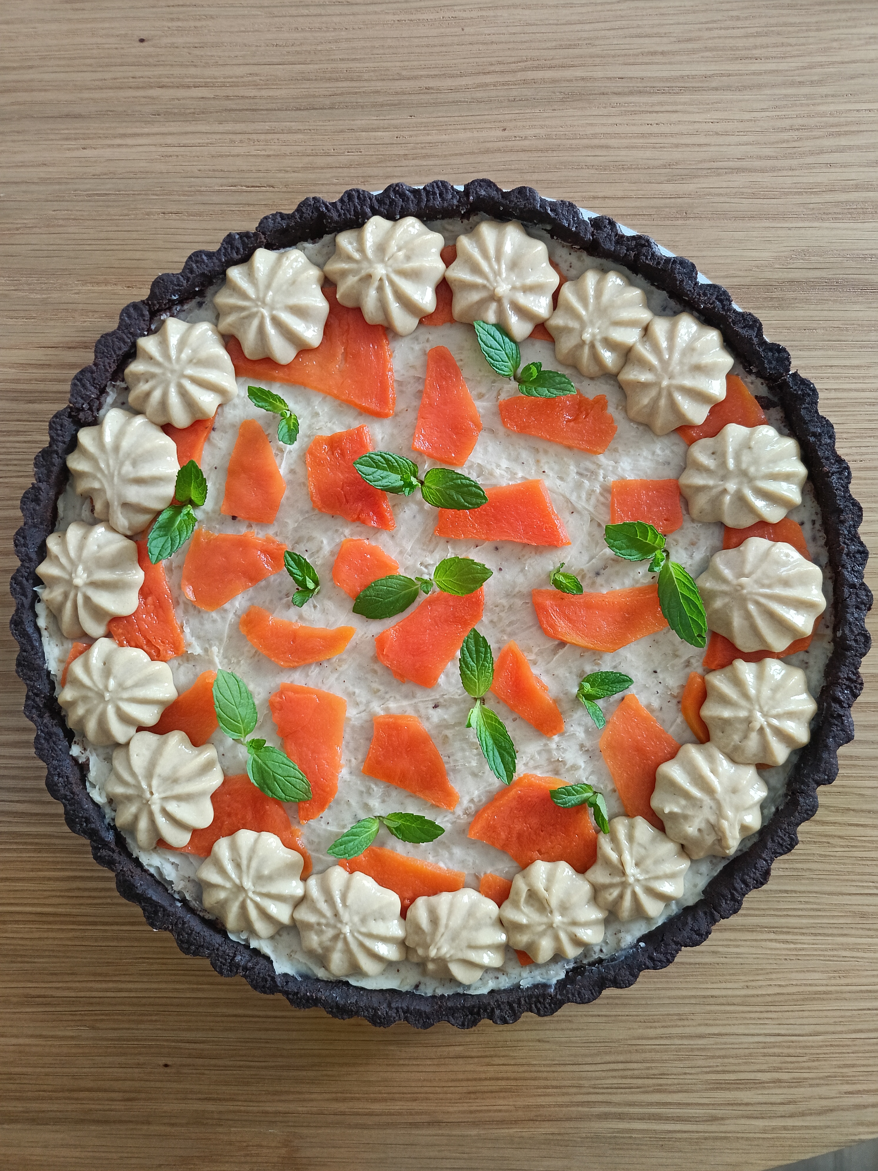 - Bütün malzemelerimiz hazır olduğunda; öncelikle tart kalıbının içine fındık kremamızı döküyor ve homojen bir şekilde eşit kalınlıkta yayıyoruz. Ardından çok küçük bir spatula yardımıyla balkabaklarını krema üzerine yerleştiriyoruz. Kenarlarına tahin musumuzu bir yıldız duy ile eşit miktarlarda sıkıyoruz. Dilerseniz en son siz de benim gibi taze nane ile dekor yapabilirsiniz.